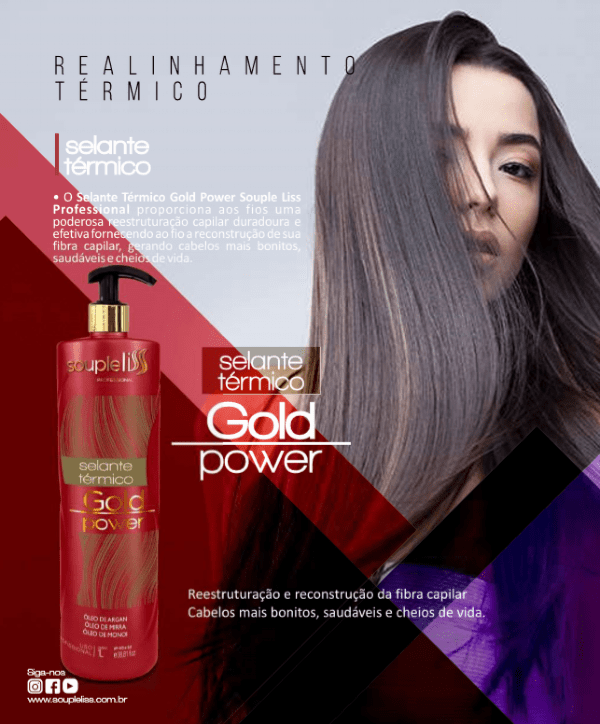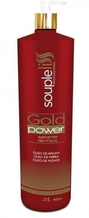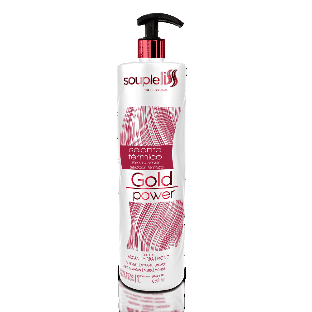 SoupleLiss Selante Térmico Gold Power 1 Litro    Soupleliss Selante Térmico Gold Power é um tratamento de alinhamento capilar indicado para todos os tipos de cabelos. Conta com Gotas de Ouro e blend de Argan, Mirra e Monoi que proporcionam reestruturação e realinhamento aos fios, deixando os cabelos muito mais bonitos. Também oferece reconstrução da fibra capilar dando vitalidade aos fios.   Modo de Usar Gold Power Souple Liss    Após a lavagem, seque de 70 a 100% dos fios com o auxílio de um secador. Aplique Soupleliss Selante Térmico Gold Power mecha a mecha, respeitando 1 cm da raiz. Dê um tempo de pausa de 20 a 40 minutos, dependendo da estrutura do cabelo, realinhando os fios com um pente fino a cada 10 minutos. Enxágue, seque, escove e pranche em mechas finas de 10 a 15 vezes cada. RESULTADOS COM SOUPLELISS SELANTE TÉRMICO GOLD POWER Soupleliss Selante Térmico Gold Power proporciona aos fios reconstrução de sua fibra, deixando-os mais bonitos, saudáveis e cheios de vida. Contém  01 Selante Térmico Capilar Souple Liss Gold Power 1litro