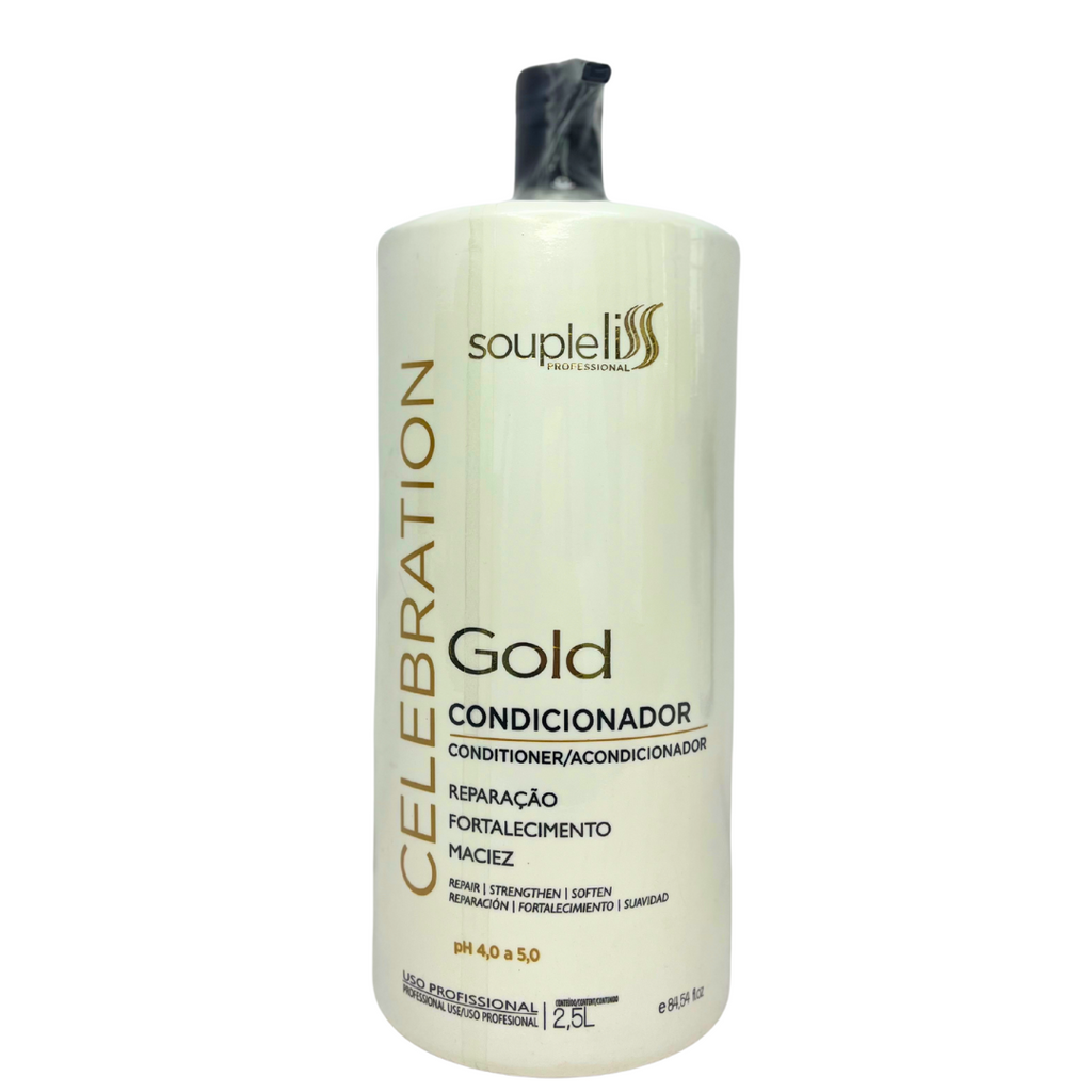 Modo de usar: Após lavar os cabelos com o Shampoo Gold Celebration Soupleliss Professional, aplicar o condicionador Gold Celebration Soupleliss Professional do comprimento as pontas, massageando os fios com suavidade para o perfeito selante das cutículas, para finalizar, enxaguar com água em abundância.