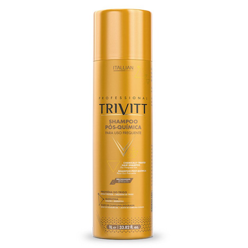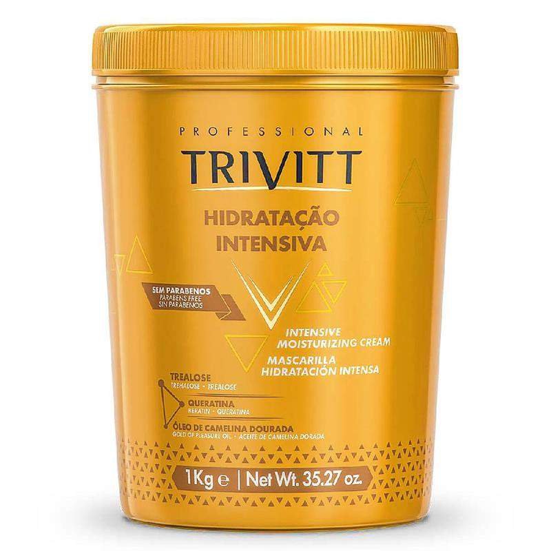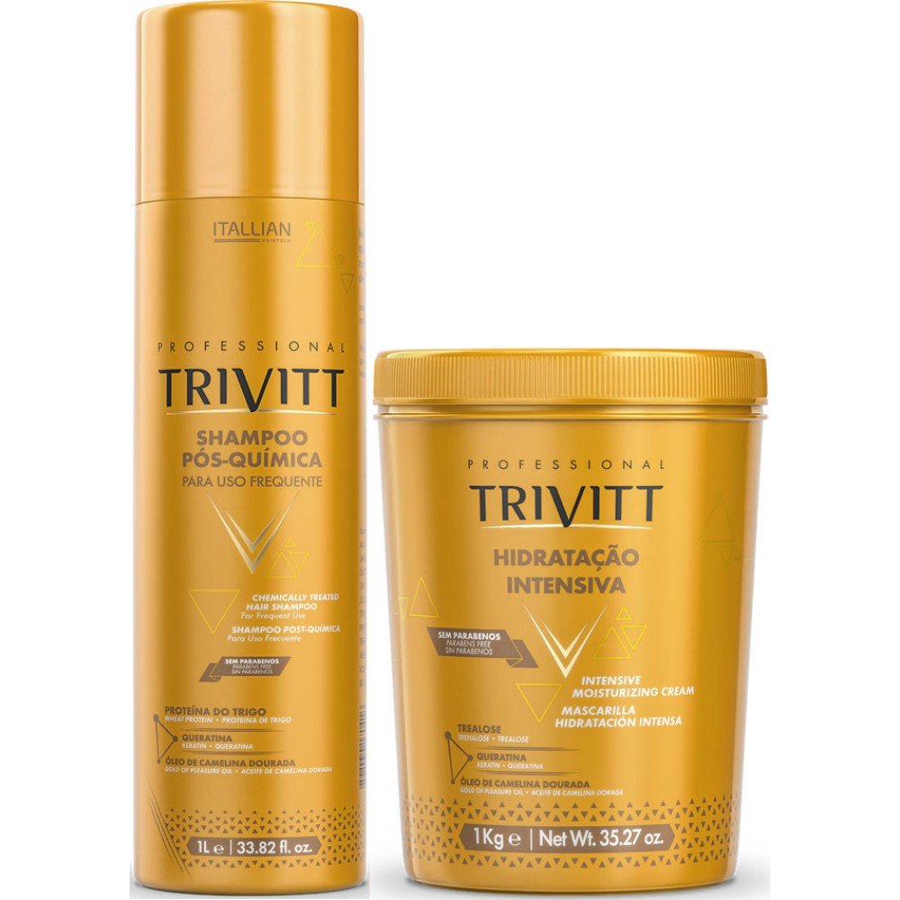 Máscara de Hidratação Intensiva Trivitt 1kgA Hidratação Intensiva Trivitt é indicada para todos os tipos de cabelo. Repara os danos com hidratação, brilho e condicionamento dos fios. Penetra na parte interna da fibra capilar e fortalece os fios contra a quebra com ingredientes altamente hidratantes, que atuam no selamento das cutículas e na reposição da hidratação perdida por mais tempo, que deixa o cabelo com brilho, resistente e condicionado.Shampoo Pós-Química para uso frequente 1l Trivitt Shampoo possui uma formulação desenvolvida para uso frequente. Retira a oleosidade dos fios sem ressecar os cabelos e couro . Para todos os tipos de cabelos. Para cabelos quimicamente tratados. Auxilia no fechamento das cutículas mantendo os cabelos saudáveis mesmo após processos químicos.Indicado para cabelos quimicamente tratados que naturalmente necessitam de cuidados específicos. Ativos: Proteína do Trigo: por ser quaternizada (carregada positivamente), apresenta alta substantividade, ou seja, adere-se com facilidade à fibra capilar (a carga positiva da proteína é atraída pela carga negativa do cabelo muito danificado). Possui grupos derivados do coco ligados à sua estrutura. Contém:01 Shampoo Pós-Química para uso frequente 1L Trivitt01 Máscara de Hidratação Intensiva Trivitt 1kg