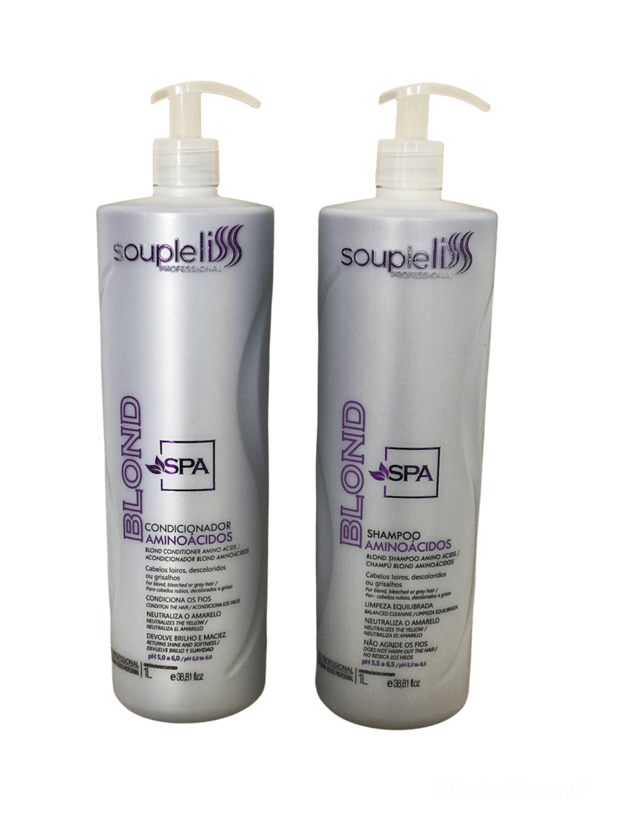 Kit SPA Blond Aminoácidos com1 - Shampoo Spa Blond Soupleliss Aminoácidos 1000ml1 - Condicionador Spa Blond Soupleliss Aminoácidos 1000mlA linha SPA Blond Soupleliss Professional foi desenvolvida com aminoácidos e pigmentos violetas que neutralizam os tons amarelados causados pela oxidação. Aumenta a elasticidade e sela as cutículas, o que confere maior luminosidade resistência e maciez aos fios e nós da Classical Life, trazemos este super produto para você, com todo o carinho e cuidado.Condicionador SPA Blond Souple LissAminoácidosPara Cabelos Loiros, Descoloridos ou Grisalhos- Condiciona os Fios- Neutraliza o Amarelo- Devolve Brilho e Maciez-----------------------------Shampoo SPA Blond Souple LissAminoácidosPara Cabelos Loiros, Descoloridos ou Grisalhos- Limpeza equilibrada- Neutraliza o Amarelo- Não Agride os FiosModo de usar: Aplique uma pequena quantidade do Shampoo SPA Blond Soupleliss Professional nas mãos e em seguida faça movimentos circulares no cabelo molhado, até formar espuma cremosa. Para melhor resultado, repita o procedimento. Após lavar com Shampoo SPA Blond Soupleliss Professional, aplicar o Condicionador SPA Blond Soupleliss Professional.Aplique uma pequena quantidade do Condicionador SPA Blond Soupleliss Professional (Não aplique diretamente no couro cabeludo) nas mãos e em seguida faça movimentos com os dedos entre os fios na extensão do cabelo úmido. Enxague em seguida. Finalizar como desejar.Advertência: Evite contato com os olhos. NÃO usar se o couro cabeludo estiver ferido ou irritado. Em caso de iritação, suspenda o uso e procurar um médico. Caso o produto entre em contato com os olhos, lavar com água corrente em abundância e procurar um medico. Guarde em local fresco, ventilado.