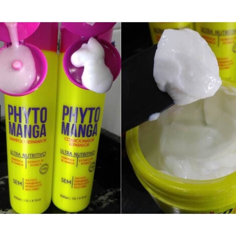 Encaracolando A Juba Creme De Pentear 500ml   Cansados dessa história de controle dos cachos, ENCARACOLANDO A JUBA CREME DE PENTEAR traz para você que é cacheada e ama sua cabeleira volumosa, a linha JUBA que define, nutre, hidrata e empodera suas madeixas com auxílio dos ativos: Manteiga de Murumuru Orgânica, Óleo de Linhaça Dourada e Extrato de Avelã. MARA, né? Agora solte sua Juba, ame seus cachos e sinta-se plena.   Kit Phyto Manga   Tratamento de uso diário desenvolvido para reparação da fibra capilar e hidratação profunda. Seus ativos naturais tem ação antioxidante, hidratante, nutritiva e emoliente. O extrato pitanga auxilia na preservação da massa capilar, prevenindo o envelhecimento precoce do cabelo. A fibra extraída da manga confere força e aumenta a resistência dos fios que estão em constante contato com processos químicos e expostos aos fatores climáticos. Diferencial: Nutrição profunda, fortalecendo e rejuvenescendo os fios, trabalhando para minimizar a quebra, maximizando o brilho e nutrição. É a combinação perfeita de antioxidante da pitanga + a fibra e lubrificação da manteiga de manga.   SHAMPOO REPARADOR PHYTOMANGA 300 ml / PH 3,5 – 4,5   CONDICIONADOR HIDRATANTE PHYTOMANGA 300 ml / PH 3,5 – 4,5   MASCARA ULTRA NUTRITIVA CC CREAM – PHYTOMANGA / PH 4,5 – 5,5