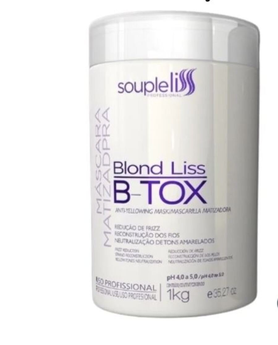 BOTOX MATIZADOR SOUPLE LISS 1KGBLOND LISSB-TOXMÁSCARA MATIZADORAREDUÇÃO DE FRIZZRECONSTRUÇÃO DOS FIOSNEUTRALIZAÇÃO DE TONS AMARELADOSBlond Liss B-tox Máscara Matizadora é um repositor da massa molecular que atua no cortex da fibra capilar, indicado para todos os tipos de cabelos. Possui formula inovadora e eficaz, com Queratina e silicone, formadores de uma pelicula protetora que envolve os fios da raiz até as pontas restaurando a flexibilidade natural dos cabelos e dando hidratação e resistência aos fios.modo de usoApós lavar os cabelos, seque os fios com o auxilio de um secador de 70% a 100% e divida em 4 partes iguais. Com auxilio de um pincel, aplique mecha a mecha o B-tox Blond Liss Matizador Souple Liss, deixando um tempo de pausa de 20 a 40 minutos.Dado o tempo de pausa, enxague o cabelo com agua em abundancia, seque, escove e pranche em mechas finas de 5 a 10 vezes cada mecha com a prancha de 180ºC a 190ºC. Finalize como desejar.