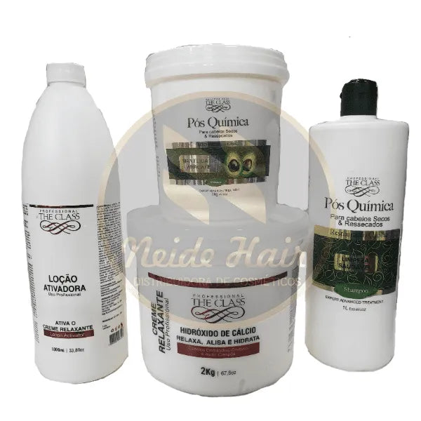 OBS: PARA SEGUIR COM A COMPRA SO PROFFISSIONAL E CHAMAR NO ZAP Para quem quer um relaxamento perfeito nós temos o melhor produto!! Trabalhe com segurança com o Relaxante The Class, a base de Hidróxido de Cálcio.  Enriquecido com: Oleo de Ojon - rico em aminoácidos e antioxidantes naturaisÓleo de Macadamia - Penetra nos poros capilares mantendo a hidratação dos fios, promove diminuição do frizz, dá brilho e repara a elasticidade natural da fibra capilar, evitando que os fios se quebrem e que pontas duplas surjam.  Conteúdo: - HIdroxido de Calcio 2kg - 1 litro de Ativador - 1 Litro de Shampoo Hidratante Pós Química - 1 kg de mascara nutritiva de Abacate Pòs Química